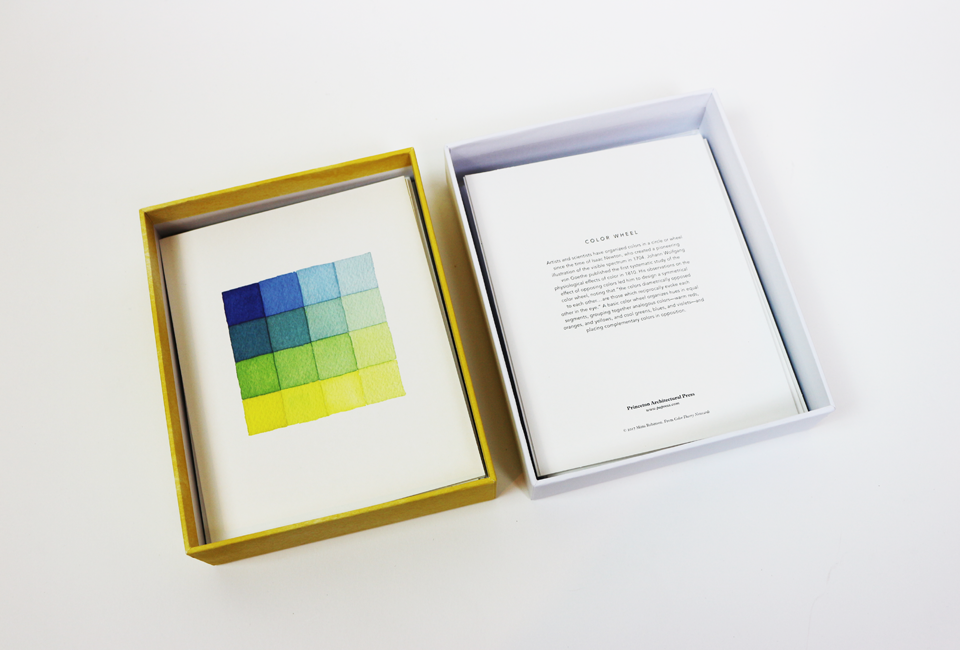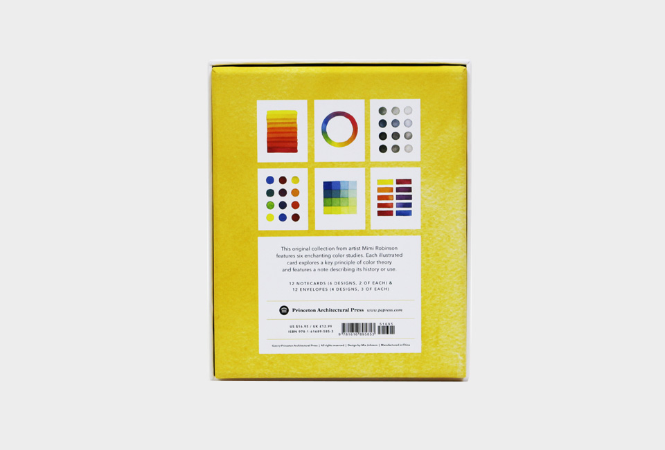 Blending a classic watercolor feel with a fresh, modern aesthetic, this notecard collection celebrates the mesmerizing beauty of color. Color has long fascinated artists, designers, philosophers, and makers of all stripes. This enchanting set from artist Mimi Robinson contains six cards illustrating key principles of color theory and four different envelope designs’each with a wash of watercolor on the inside of the flap. All cards feature a detailed caption explaining the principle of color theory illustrated on the front of the card.