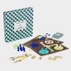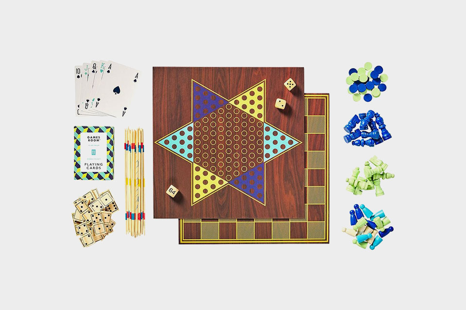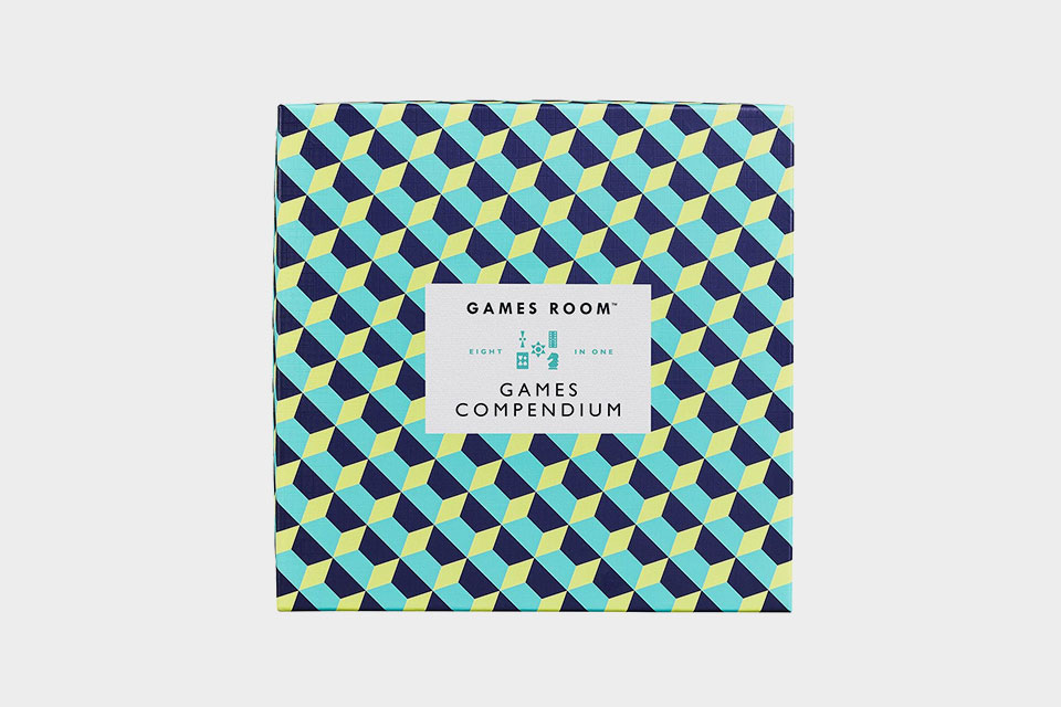 Compendium of popular Games Room games, including Backgammon, Chess, Chinese Checkers, Dominoes, Checkers, Snakes and Ladders, Nine Men Morris, Ludo, Pick-up Sticks and Playing Cards. Packaged in a geometric box.