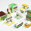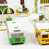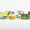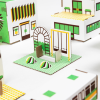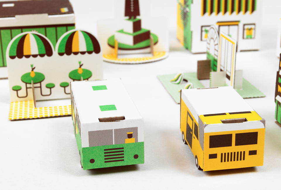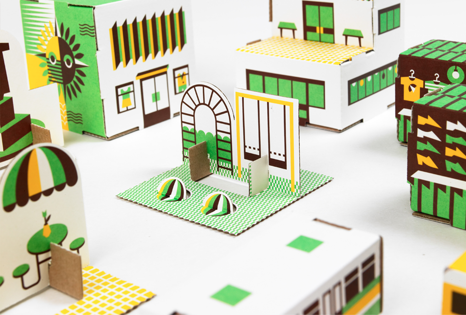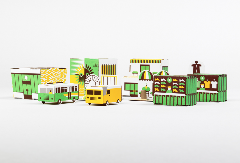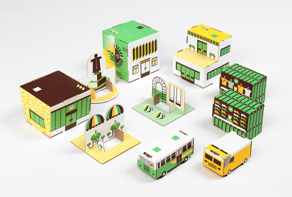 A set of recycled cardboard fold-up houses, playgrounds, gas stations, department stores and other elements.