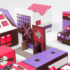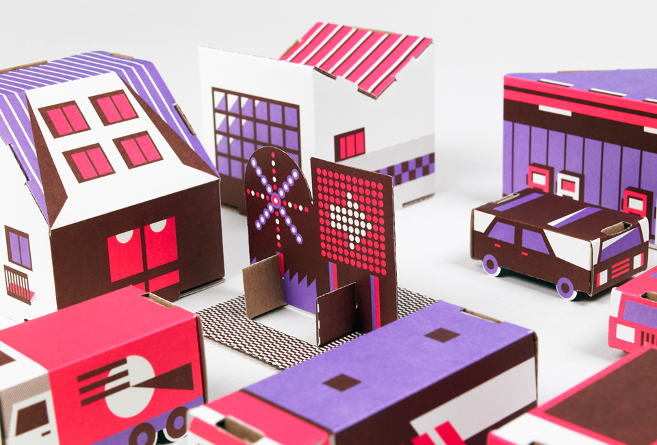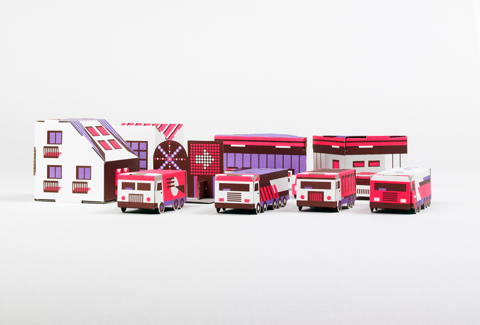A set of recycled cardboard fold-up houses, playgrounds, gas stations, department stores and other elements.