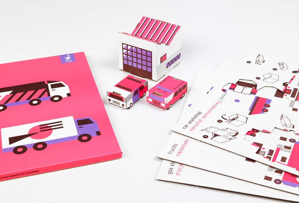 A set of recycled cardboard fold-up houses, playgrounds, gas stations, department stores and other elements. Each box contains four sheets of brown cardboard with a fine color print. All 10 elements are precisely cut and ready to fold. They are also quite resistant and difficult to destroy. No glue or extra tools necessary to spend some minutes assemblying and hours of fun playing. There are 3 different sets that can be freely combined. See the others bellow.