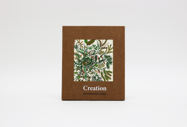 Creation myths of the Gond community, rendered in the intricate Gond tribal art style from central India. This set of beautiful handmade cards contains 10 blank cards – 2 each of 5 images – with envelopes, and comes in a specially crafted box. Each card has been silkscreen-printed on recycled paper at our sustainable print workshop, which employs, trains and nurtures young bookmaking artisans.