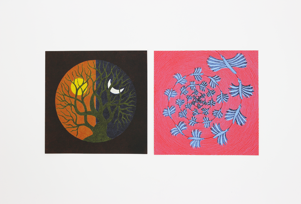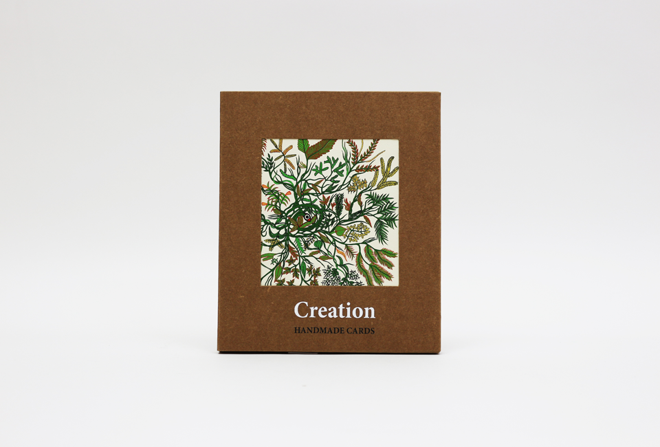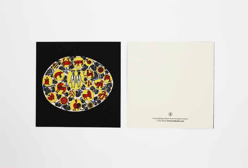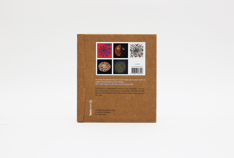 Creation myths of the Gond community, rendered in the intricate Gond tribal art style from central India. This set of beautiful handmade cards contains 10 blank cards – 2 each of 5 images – with envelopes, and comes in a specially crafted box. Each card has been silkscreen-printed on recycled paper at our sustainable print workshop, which employs, trains and nurtures young bookmaking artisans.