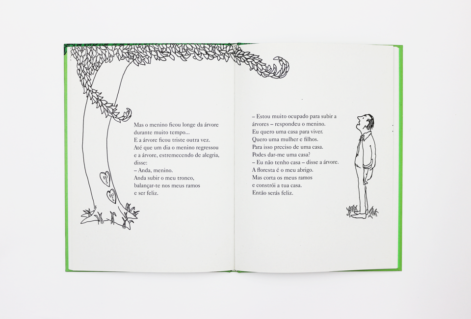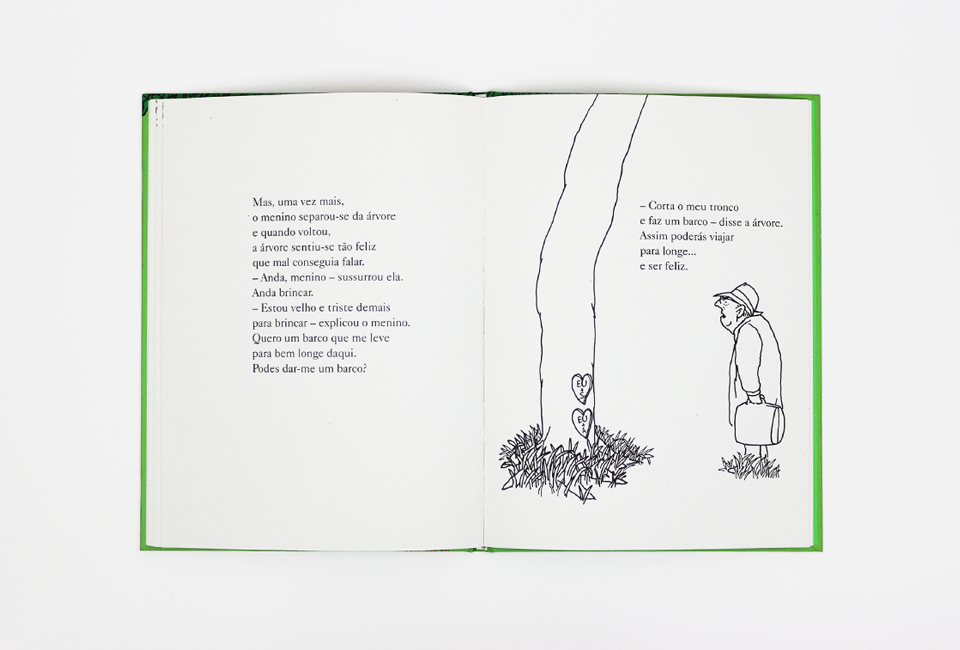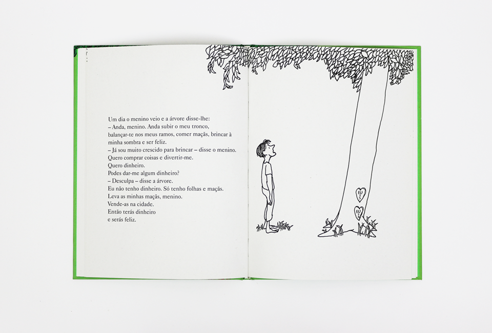 Este livro é o mais conhecido do escritor e ilustrador norte-americano Shel Silverstein. O clássico, escrito em 1964, comoveu gerações com a história de uma árvore e um menino. Com poucas palavras, Silverstein fala da relação entre o homem e a natureza, onde uma árvore oferece tudo a um menino, que a deixa de lado ao crescer ao mesmo tempo que se torna num homem egoísta. Mas para agradar ao menino que ama, a generosidade desta árvore não tem fim – ainda que isto signifique a sua própria destruição. Em primeiro plano, uma lição de consciência ecológica: o homem pequeno, mesquinho, frente à generosidade e à força da natureza. No entanto, a dinâmica que vemos entre o menino e a árvore fala também da passagem do tempo e dos valores que são reavaliados com ela. A árvore ensina, por meio do afecto, uma relação de troca sincera e desinteressada – essa que o homem parece desaprender com as exigências da vida adulta.