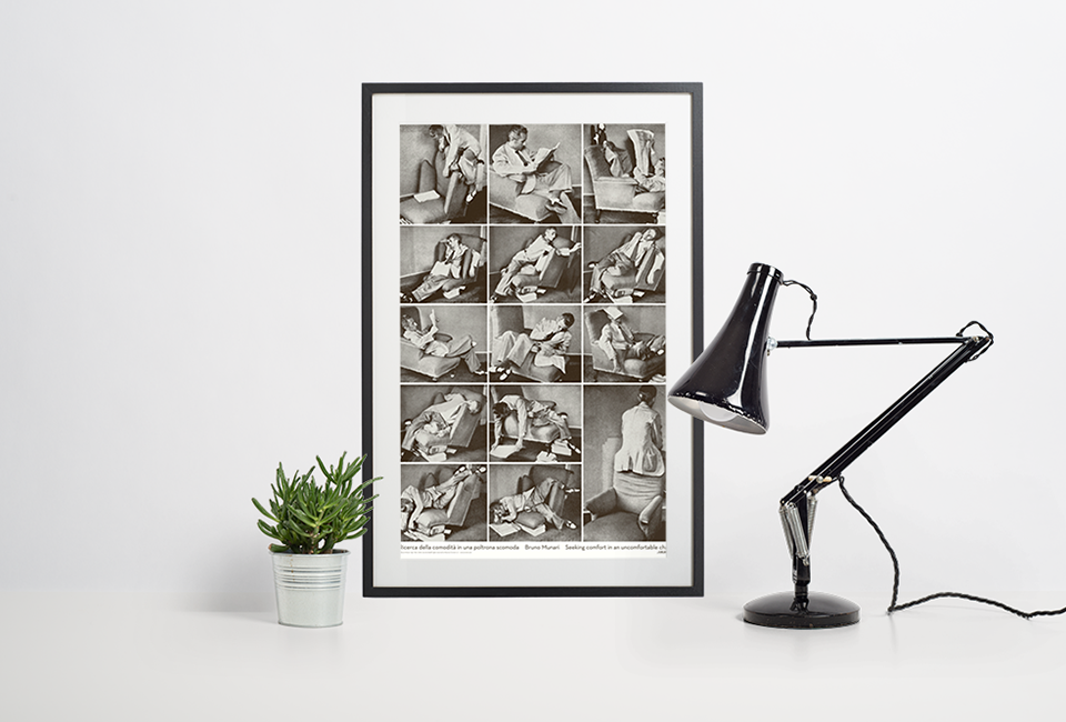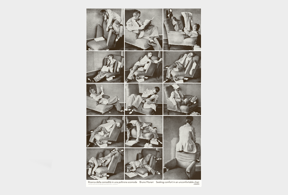 Este poster reúne a série completa de fotos de Bruno Munari intitulada “Procurando conforto numa cadeira desconfortável!”, datadas de 1944. As 14 imagens tecem uma consideração sobre a “desistência” do conforto em favor de um visual único e elegante ao projetar objetos. Neste caso específico, o objeto é uma cadeira que, ao invés de ser um lugar confortável onde se pode descansar ao final do dia, nos obriga a explorar posturas novas e não tão relaxantes!