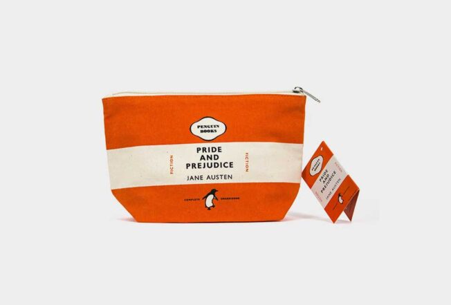 Nada mais clássico do que este estojo laranja com a icónica capa da Penguin para o romance “Pride and prejudice” de Jane Austen.