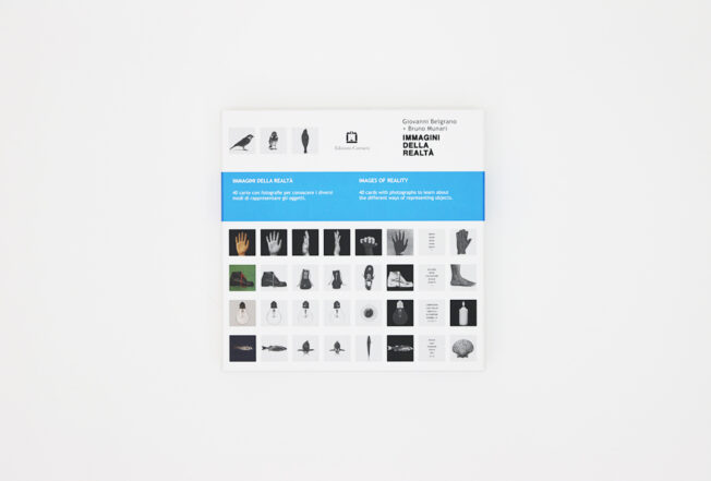 Criado por Bruno Munari e Giovanni Belgrano, o jogo “Images of Reality” contém 40 cartas com fotografias que apresentam vários objectos vistos de vários pontos de vista e de várias maneiras. Um sapato, uma mão, um peixe ou uma lâmpada podem parecer muito diferentes se os observarmos de perspectivas diferentes, ou se os observarmos como objectos em mudança, onde o nome é apenas uma das muitas representações possíveis. Comparando a fotografia realista a cores com a fotografia a preto e branco, o negativo fotográfico e o último passo da palavra escrita (em seis línguas: italiano, inglês, francês, alemão, espanhol e japonês), o jogo estimula a aprendizagem das diferenças entre objectos reais e as suas representações.