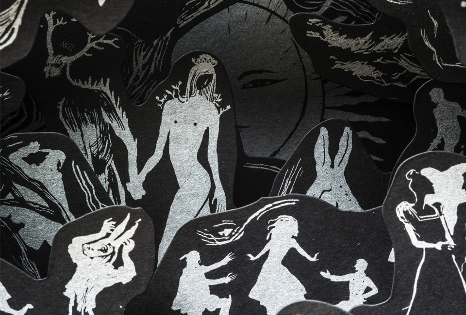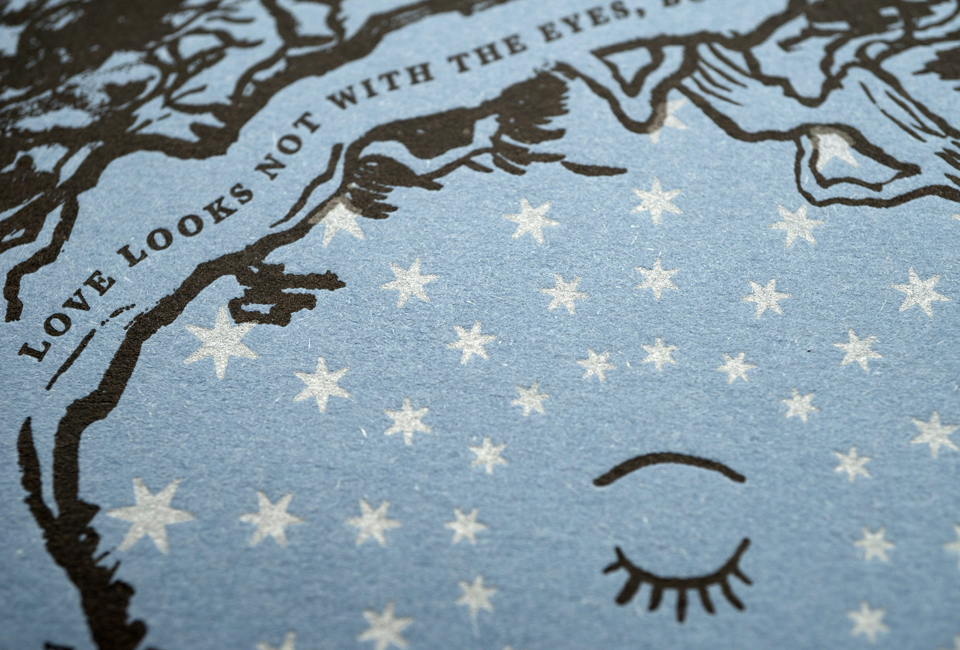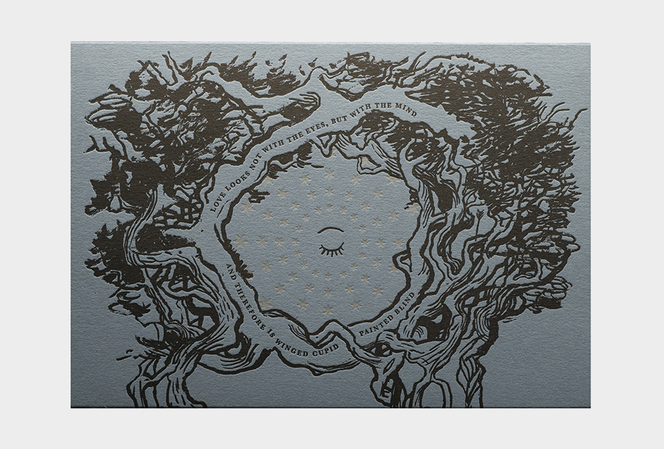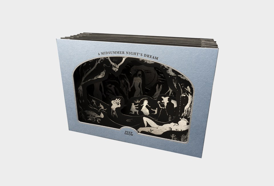 Livro-túnel impresso em serigrafia e tipografia tradicional representando a peça “Sonho de uma noite de verão” de William Shakespeare.