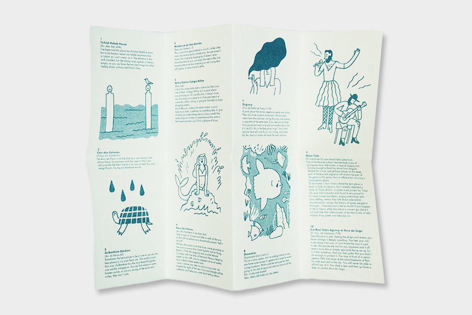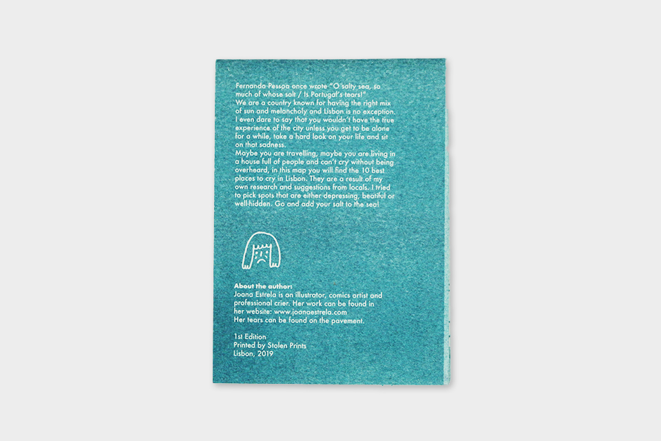 Mapa ilustrado, impresso em risografia, com os 10 melhores locais para chorar em Lisboa. Uma seleção de espaços públicos para visitar quando precisar se ficar sozinho e deixar sair tudo.