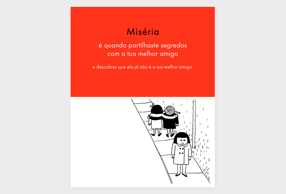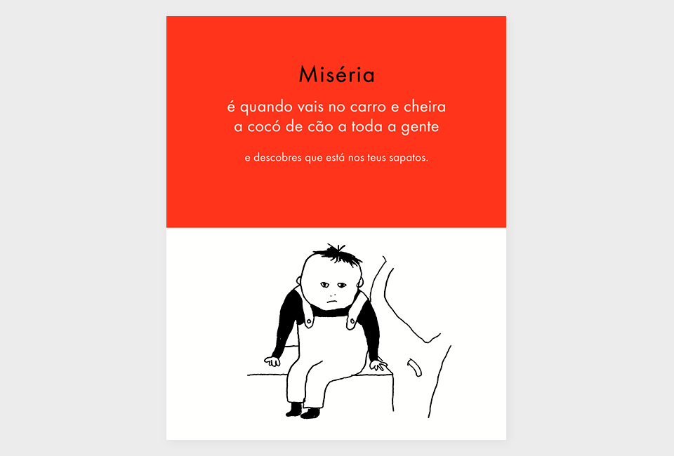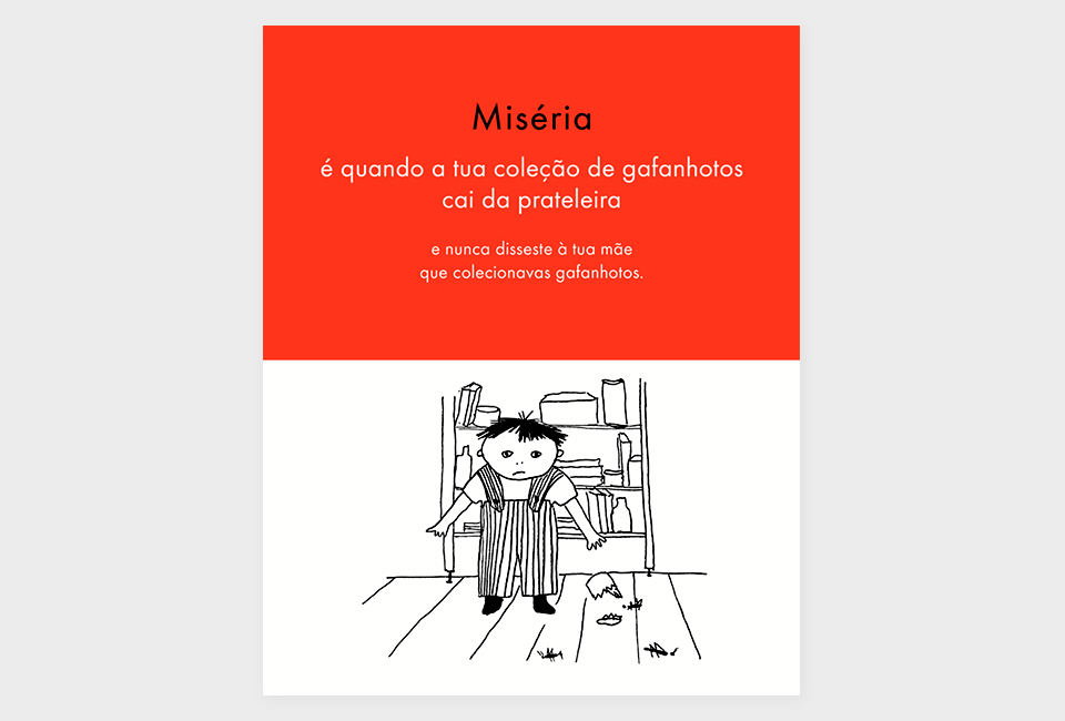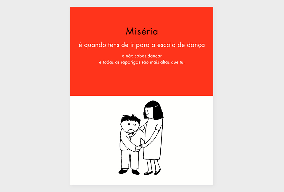 Já alguma vez gastaram as vossas últimas moedas num gelado e ele vos caiu ao chão? Já vos ofereceram uma prenda que já tinham e não puderam dizer nada? Já tiveram sarampo no dia do vosso aniversário? Já partilharam segredos com um melhor amigo e depois descobriram que ele já não era o vosso melhor amigo? Estes e outros infortúnios fazem parte do hilariante compêndio que é “Miséria”, um livro onde tanto miúdos como graúdos de boa memória se verão refletidos na difícil arte de ser criança, tantas vezes dissimulada por uma visão romantizada da infância, essa miserável e delico-doce ficção criada pelos adultos que não se apercebem o quão miseráveis as crianças se podem sentir.