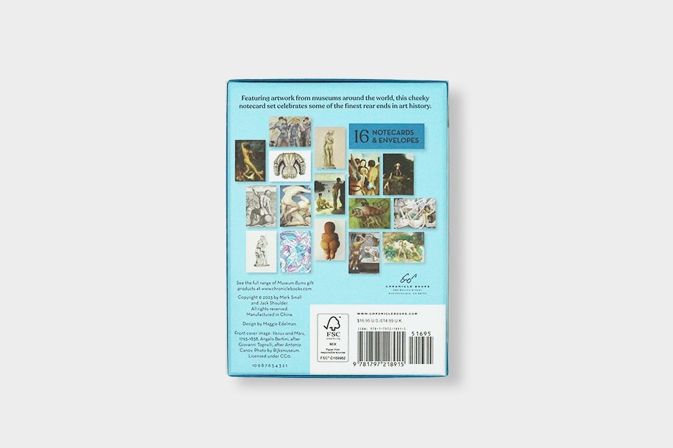 Uma celebração da arte clássica, da história e de glúteos bem torneados, os cartões Museum Bums certamente farão qualquer destinatário rir. Dos glúteos deliciosamente renderizados da pintura renascentista às curvas abstratas da arte contemporânea, estes dezesseis cartões (com envelopes) para todas as ocasiões são um espetáculo digno de ser visto! Os estudiosos do património e professores de arte Mark Small e Jack Shoulder combinam legendas bem humoradas com representações cativantes de belíssimos glúteos, e por vezes atrevidos, na arte. O resultado é uma celebração e um estudo da abundância de glúteos e das suas impressões eternas.
