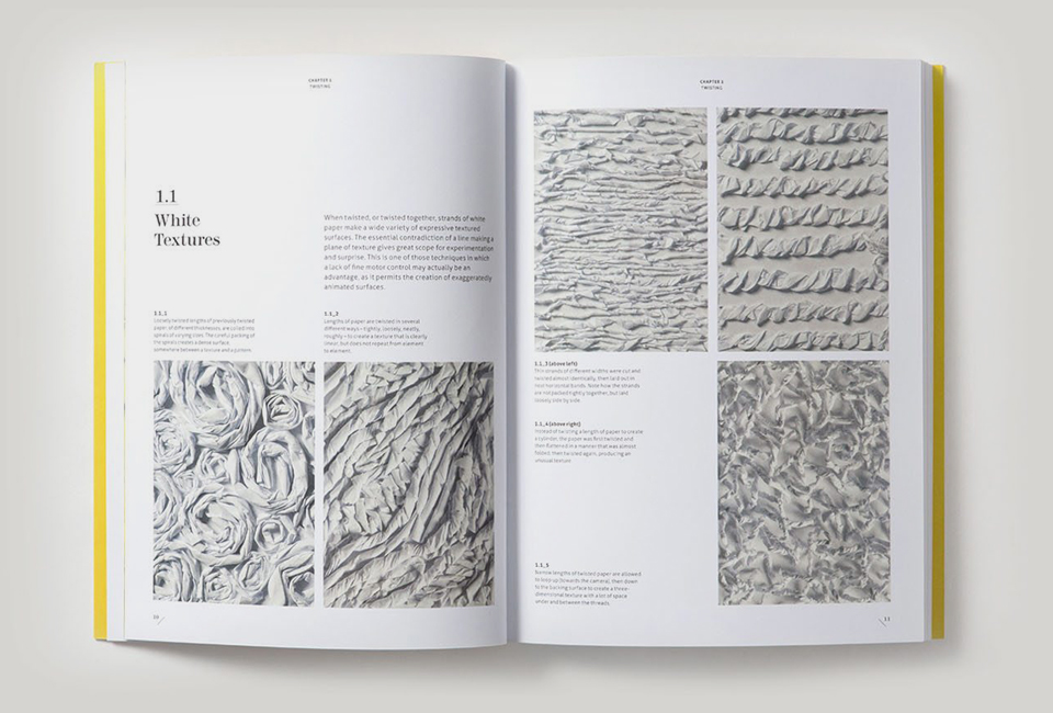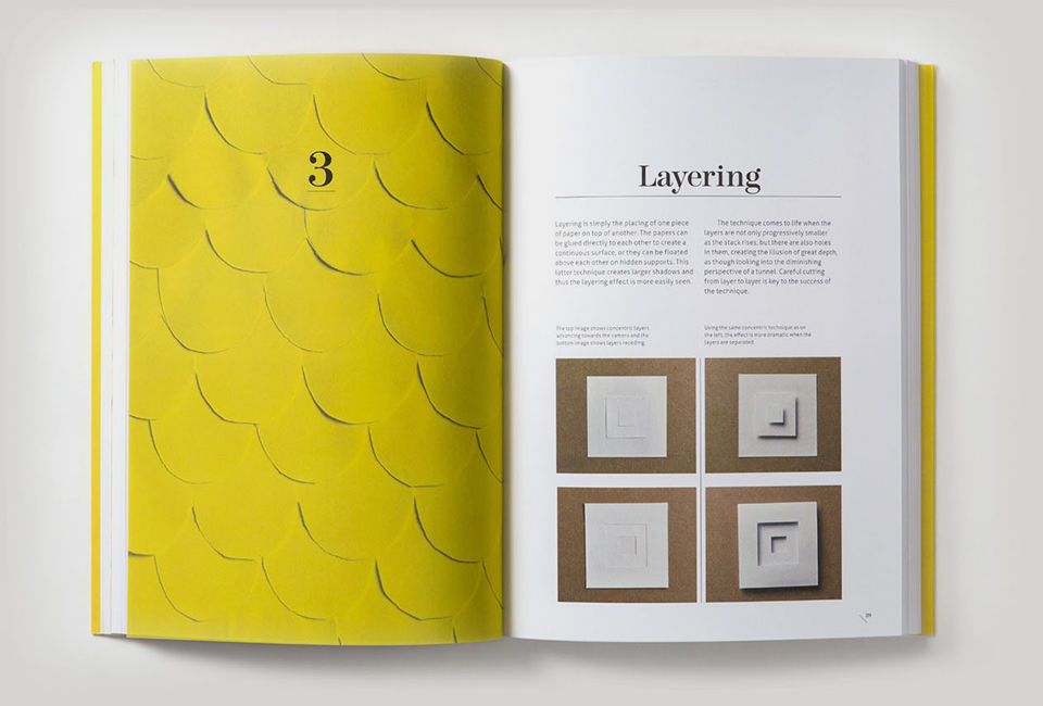 Existem 12 técnicas diferentes, cada uma delas belamente ilustrada com exemplos criativos, primeiro feitos em papel branco e depois em papéis de cores, gramagem e texturas diferentes. Por fim, fotografias inspiradoras mostram as técnicas aplicadas por designers a roupas, móveis, jóias e utensílios domésticos, além de obras de arte.