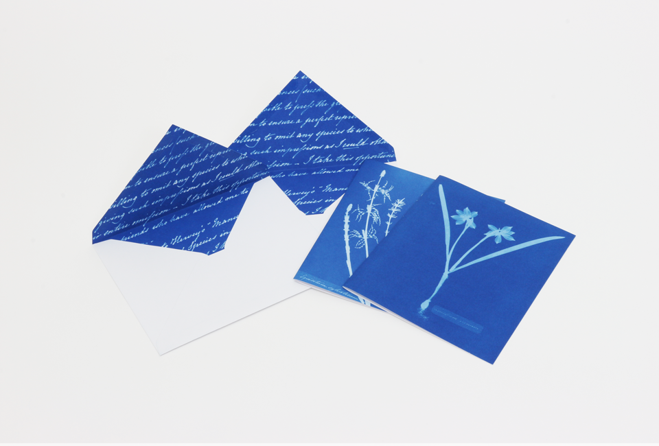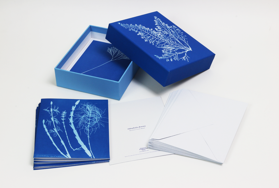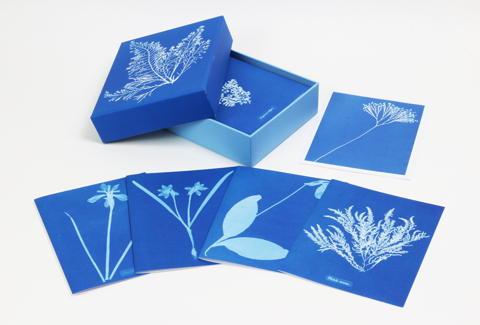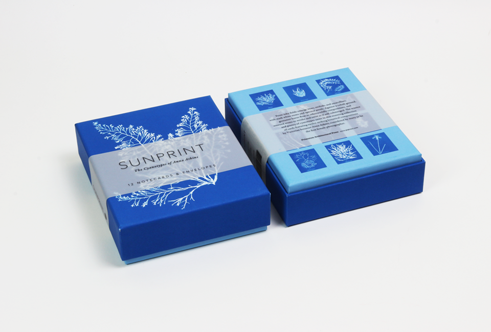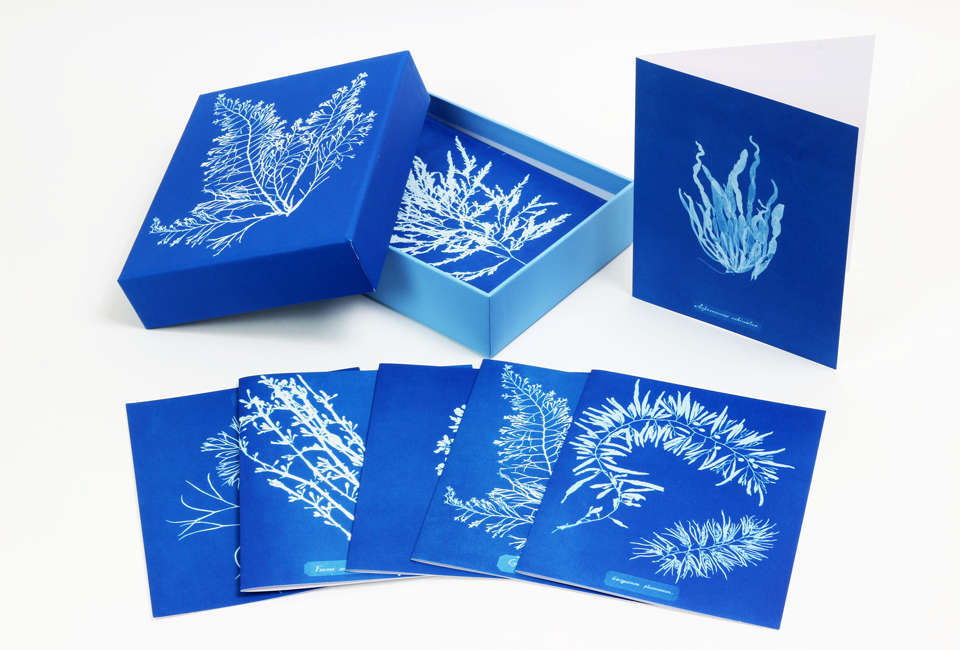 Considerada como a primeira fotógrafa (e a primeira a publicar um livro de fotografias: Photographs of British Algae: Cyanotype Impressions), a botânica vitoriana Anna Atkins fez deslumbrantes cianótipos (processo de impressão fotográfica em tons azuis) de centenas de plantas diferentes. Esta caixa reúne doze desses fotogramas com algas, fetos e iridáceas em tons ricos e com detalhes maravilhosos. Os envelopes são igualmente impressos no interior com imagens em cianótipo das páginas manuscritas dos cadernos de Atkins.