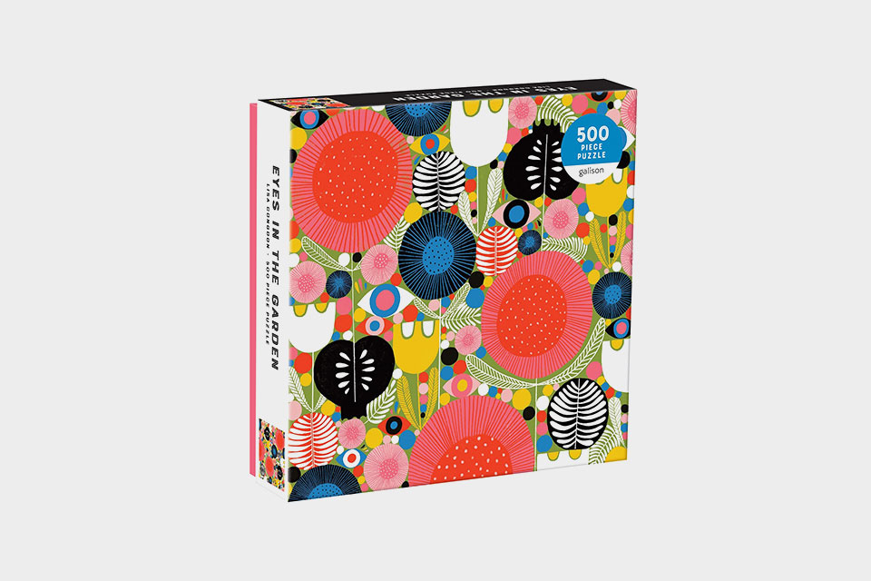 «Eyes In The Garden», um puzzle de 500 peças, apresenta a arte colorida de Lisa Congdon, conhecida pelos seus desenhos coloridos e trabalho de caligrafia.