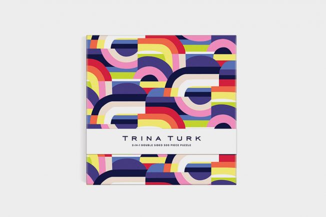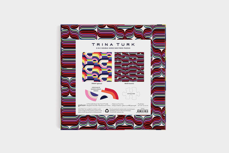 O puzzle de dupla face Trina Turk (500 peças) apresenta duas imagens abstratas diferentes, assim como 15 peças geométricas. As peças são impressas de um lado a mate e do outro com um verniz brilhante, para facilitar a identificação. Os puzzles da Galison são embalados em caixas resistentes com acabamento fosco, perfeitas para oferecer, reutilizar e armazenar.