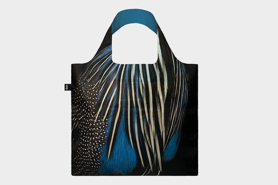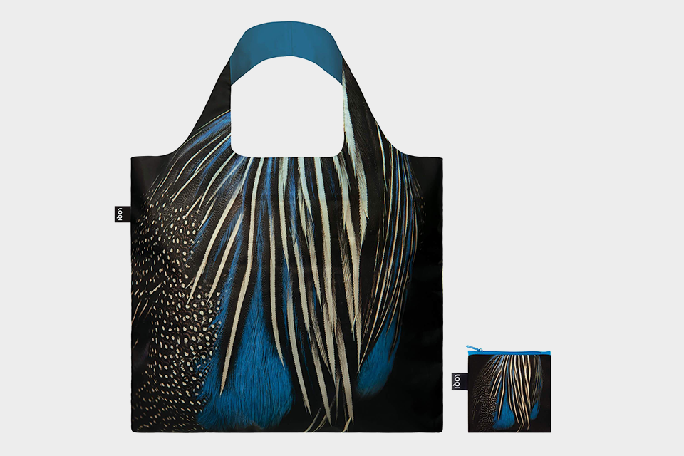 O saco Guineafowl, feito a partir de uma foto de Joel Sartore, exibe a bela plumagem da Galinha de Angola com penas pretas e azul cobalto.