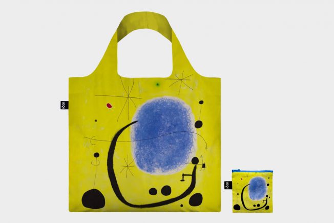 Gold of Azure evoca céus azuis tranquilos e espaços abertos no saco reciclado. Este desenho, com estrelas, linhas e pontos sobre uma superfície amarela vibrante, reflete a evolução de Miró numa linguagem simbólica e colorida. © Successió Miró 2024. Fundació Joan Miró, Barcelona.