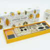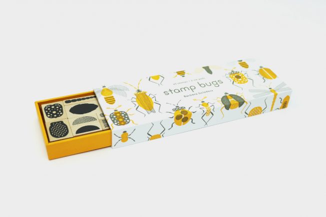 Abelhas, libélulas, pirilampos, joaninhas, aranhas! Esta robusta caixa em estilo caixa de fósforos contém vinte e cinco carimbos de borracha com suporte de madeira e uma variedade de formas e texturas. Um verdadeiro kit de peças de insetos – cabeças, corpos, antenas, pernas -, tudo o que precisa para criar seus insetos favoritos ou inventar novos! As combinações são infinitas.