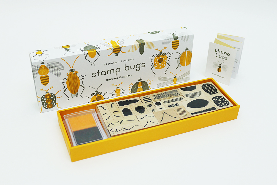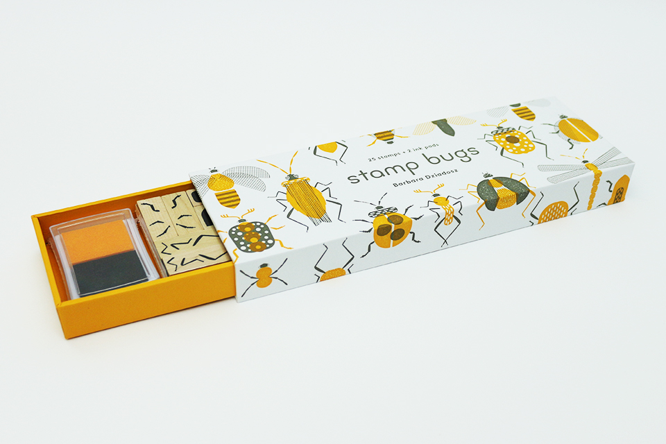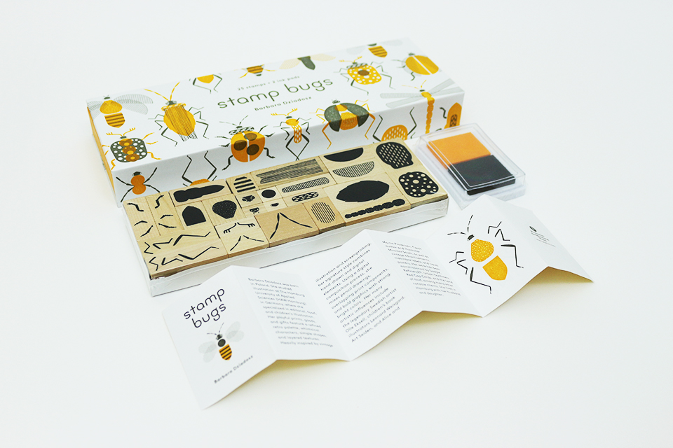 Abelhas, libélulas, pirilampos, joaninhas, aranhas! Esta robusta caixa em estilo caixa de fósforos contém vinte e cinco carimbos de borracha com suporte de madeira e uma variedade de formas e texturas. Um verdadeiro kit de peças de insetos – cabeças, corpos, antenas, pernas -, tudo o que precisa para criar seus insetos favoritos ou inventar novos! As combinações são infinitas.