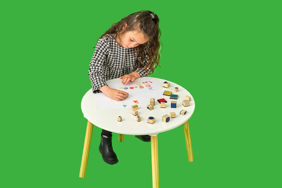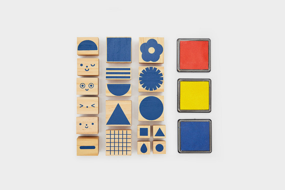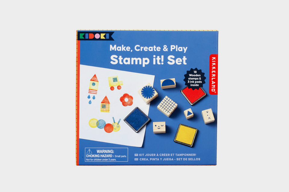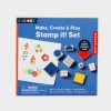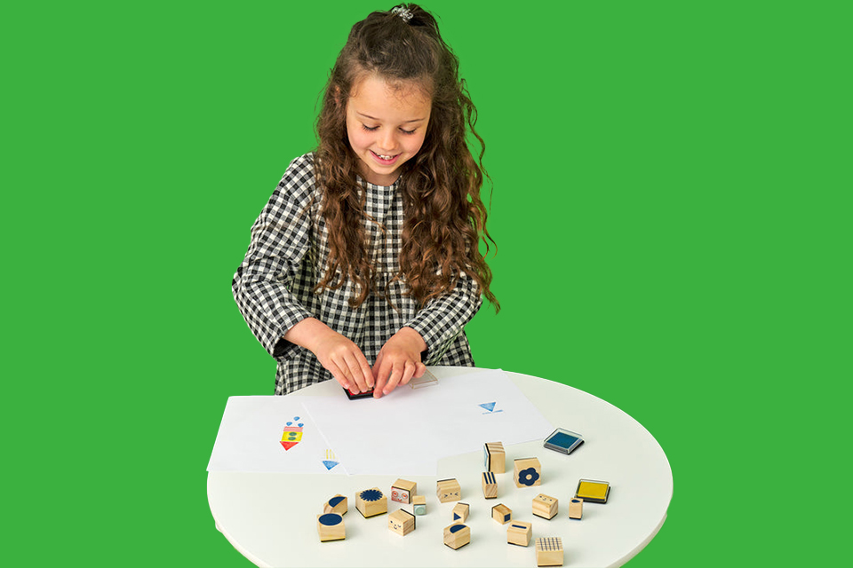 Para criar e brincar. Esta caixa inclui 18 carimbos e 3 almofadas de tinta laváveis para criar inúmeras imagens e personagens: desde insetos e carros, a casas e foguetões.