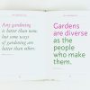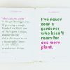 “The Gardener Says” convida os leitores para uma festa no jardim, onde convidados como Gertrude Jekyll, Henry David Thoreau, Michelle Obama, Michael Pollan, etc., compartilham suas ideias e palavras de inspiração. São citações de jardineiros, poetas, filósofos e paisagistas que destacam as alegrias e os desafios da jardinagem – a exaustão no final de um longo dia de trabalho, a satisfação de ver uma flor desabrochar, a paz e a felicidade do tempo passado em contemplação silenciosa. Um passatempo delicioso, uma ferramenta poderosa para a transformação ecológica e social e um lembrete crucial do nosso próprio lugar na natureza.
