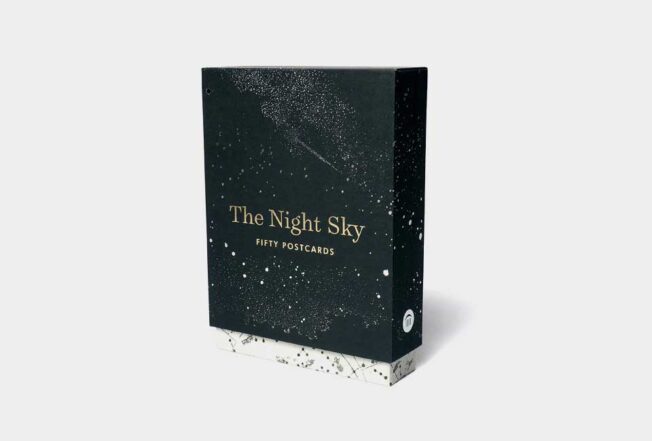 Qual o nosso lugar no universo? Desde que os humanos fazem esta pergunta, procuram a resposta no céu noturno. Seja através de esboços, experiências científicas, fotografia ou pintura, somos fascinados pelo estudo do que está além. Esta bela caixa impressa com folha dourada contém cinquenta postais, cada um com uma imagem sublime: páginas dos cadernos de desenho de Galileu, mapas estelares chineses, interpretações artísticas do universo e imagens raramente vistas dos arquivos da NASA.