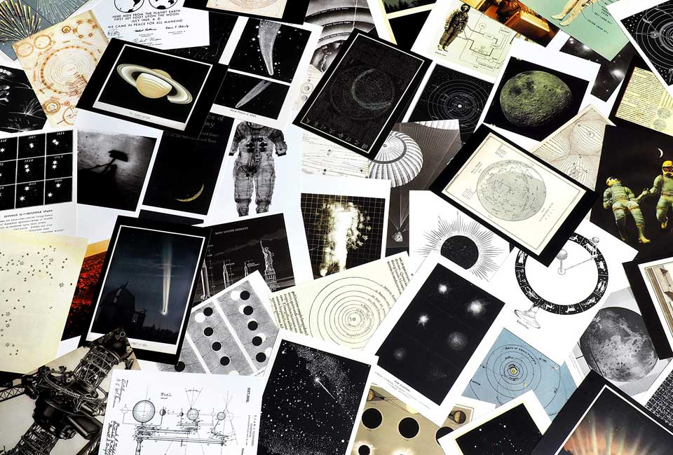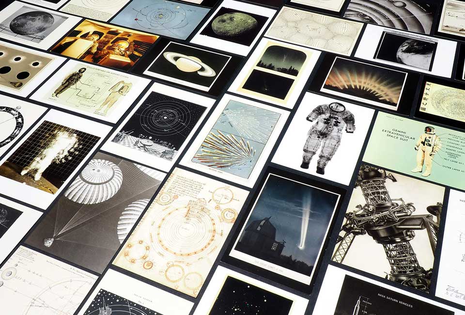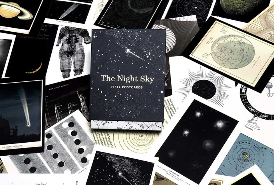 Qual o nosso lugar no universo? Desde que os humanos fazem esta pergunta, procuram a resposta no céu noturno. Seja através de esboços, experiências científicas, fotografia ou pintura, somos fascinados pelo estudo do que está além. Esta bela caixa impressa com folha dourada contém cinquenta postais, cada um com uma imagem sublime: páginas dos cadernos de desenho de Galileu, mapas estelares chineses, interpretações artísticas do universo e imagens raramente vistas dos arquivos da NASA.