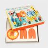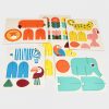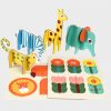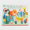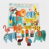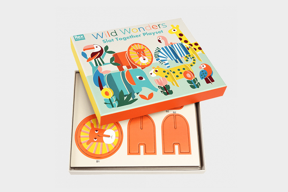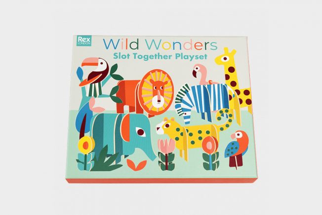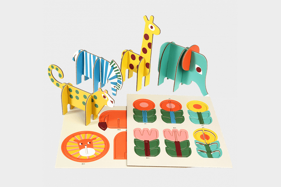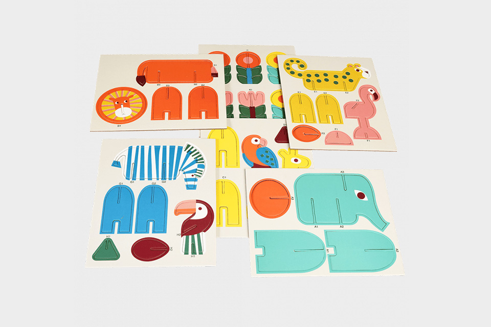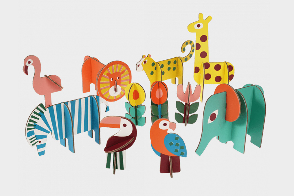 Uma caixa que contém 11 animais e flores, feitas de cartão grosso, com vários formatos e tamanhos para montar. Basta retirar as peças e encaixá-las para facilmente criarmos a nossa própria selva.